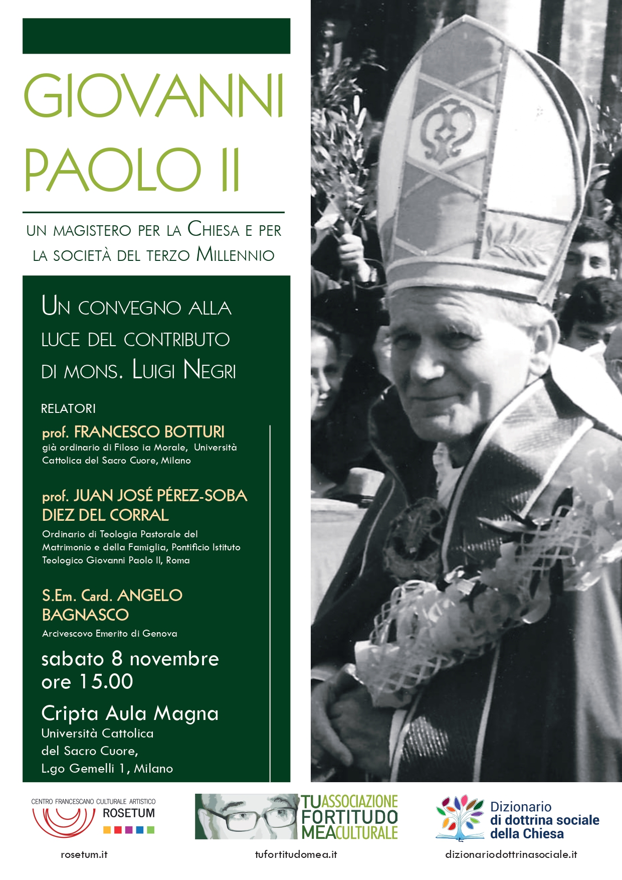 A vent’anni dalla morte di san Giovanni Paolo II (2 aprile 2005), la nostra Associazione, insieme al Centro di Ateneo per la dottrina sociale della Chiesa dell’Università Cattolica, al Centro Francescano Culturale Artistico Rosetum, alla rivista Tempi e all’Associazione culturalre Esserci, ha organizzato un convegno che, insieme a valorizzare il contributo di mons. Luigi Negri nello studio e nella diffusione del magistero di questo Pontefice, intende riprendere e approfondire alcuni aspetti dell’insegnamento del Papa polacco.