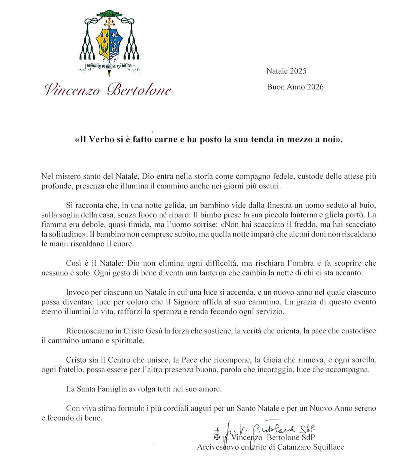 Invoco per ciascuno un Natale in cui una luce si accenda, e un nuovo anno nel quale ciascuno possa diventare luce per coloro che il Signore affida al suo cammino. La grazia di questo evento eterno illumini la vita, rafforzi la speranza e renda fecondo ogni servizio.