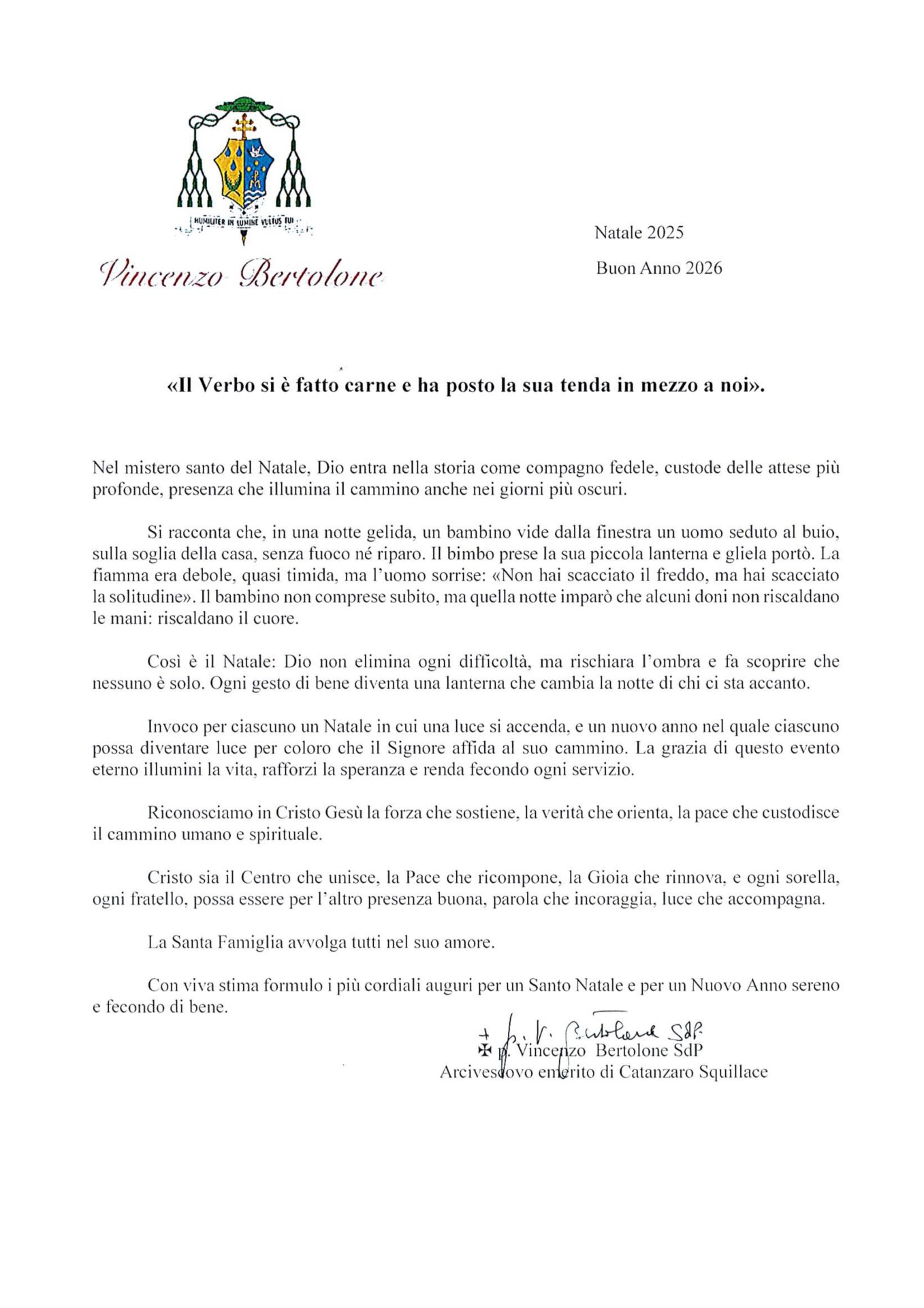 Invoco per ciascuno un Natale in cui una luce si accenda, e un nuovo anno nel quale ciascuno possa diventare luce per coloro che il Signore affida al suo cammino. La grazia di questo evento eterno illumini la vita, rafforzi la speranza e renda fecondo ogni servizio.